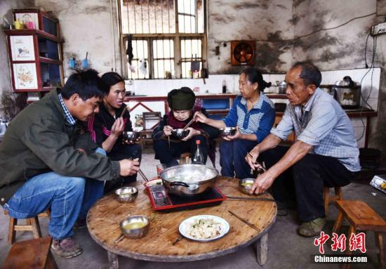 在“中国长寿之乡”广西桂林市恭城瑶族自治县西岭乡岭脚村,居住着目前桂林市年龄最大的长寿老人——114岁的王玉琼。12月8日,记者探访了这位百余岁长寿老人的生活。老人与人交谈思维清晰,说话流利,还坚持每天自己打水洗澡、洗脸,自己打水洗衣服,生活自理,老人也一直有抽烟喝酒的习惯。图为12月8日,王玉琼与家人一起吃午餐。唐梦宪 摄