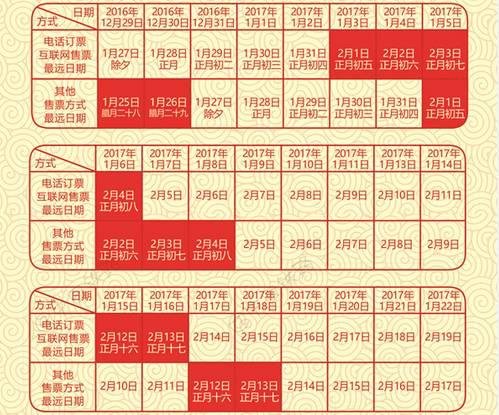 据此推算,2017年春运首日火车票网络、电话渠道将从2016年12月15日开售,而窗口等线下渠道则从12月17日开售。