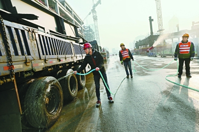 昨天,京城持续雾霾重污染天气。CBD核心区各建筑工地全部按照要求停止户外土石方作业,工作人员采用人工与机器相配合的方式喷水降尘。 本报记者 孙戉摄