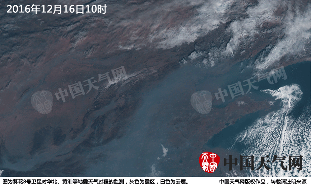 卫星监测显示,16日我国霾区为75.7万平方公里。17日上午霾区扩展至101万平方公里左右,到18日上午约为142.2万平方公里,19日上午,霾区范围依然很广泛,约为141万平方公里。19日夜间开始,华北、黄淮等地霾天气进入最严重时段,范围明显扩大,20日灰霾天波及吉林、辽宁、北京、天津、河北、山东、河南、陕西、山西、湖北、安徽、江苏等12省市。(注明:图中白色移动的部分为高云,位置不变的灰色地带就是霾区。 来源于:风云三号卫星、葵花8号卫星和地面PM2.5监测结果)