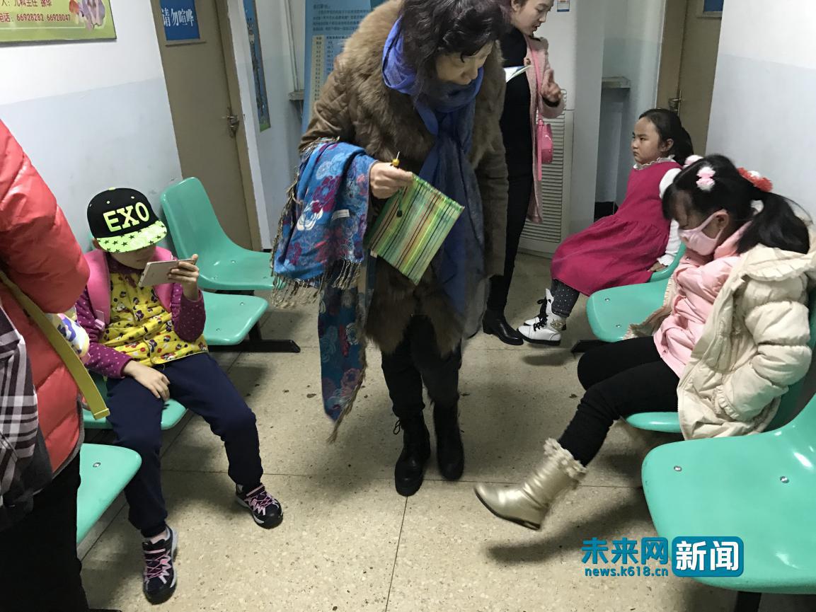 图为儿科呼吸道科外,家长带着孩子等待就医。未来网记者 韩胜男 摄
