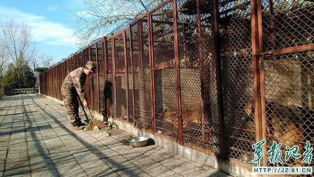 照顾退役军犬的战士在打扫犬舍。罗秉坤 摄