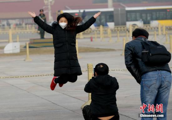 12月21日,北京持续雾霾。图为游客在天安门广场参观。中新社记者 杜洋 摄