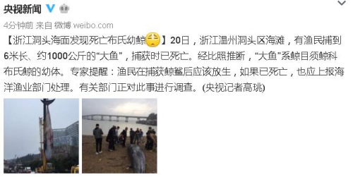 20日,浙江温州洞头区海滩,有渔民捕到6米长、约1000公斤的“大鱼”,捕获时已死亡。经比照推断,“大鱼”系鲸目须鲸科布氏鲸的幼体。专家提醒:渔民在捕获鲸鲨后应该放生,如果已死亡,也应上报海洋渔业部门处理。有关部门正对此事进行调查。(央视记者高珧)