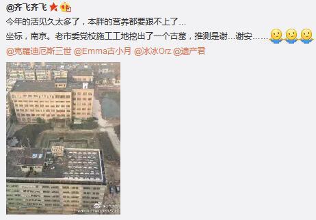 交汇点讯 12月22日下午17:17,一名叫齐飞齐飞的网友发的一条微博引起了很多人的关注,微博中写到“坐标,南京。老市委党校施工工地挖出了一个古墓,推测是谢…谢安……”这条微博在短时间内转发过万。