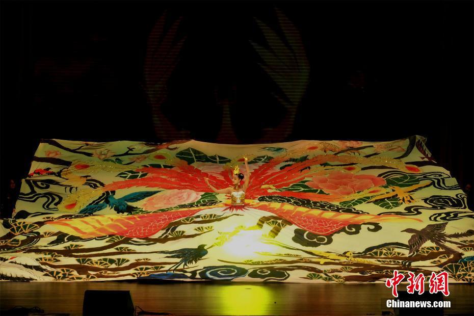 近日,在重庆理工大学会计学院年度颁奖典礼暨文艺晚会上,当晚压轴出场的舞蹈《百鸟朝凤图》,令现场千余名师生赞叹不已,发布到网上后火爆了微信朋友圈。据了解,该作品是重庆理工大学三名95后女大学生纯手工打造的,从设计到制作共历时两个月时间,从讨论到设计定稿、画图上色、缝制金线,再到成衣,这件《百鸟朝凤图》裙摆长约9米、宽约8.5米,以人身为凤头,裙摆为凤翼,展开就宛如浴火重生的凤凰一般。钟欣 摄