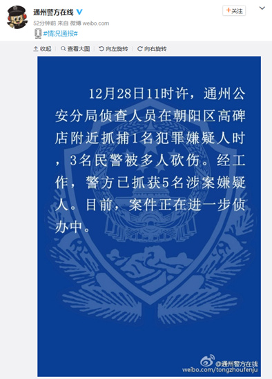 中新网12月29日电 据北京市公安局通州分局官方微博消息,12月28日11时许,通州公安分局侦查人员在朝阳区高碑店附近抓捕1名犯罪嫌疑人时,3名民警被多人砍伤。经工作,警方已抓获5名涉案嫌疑人。