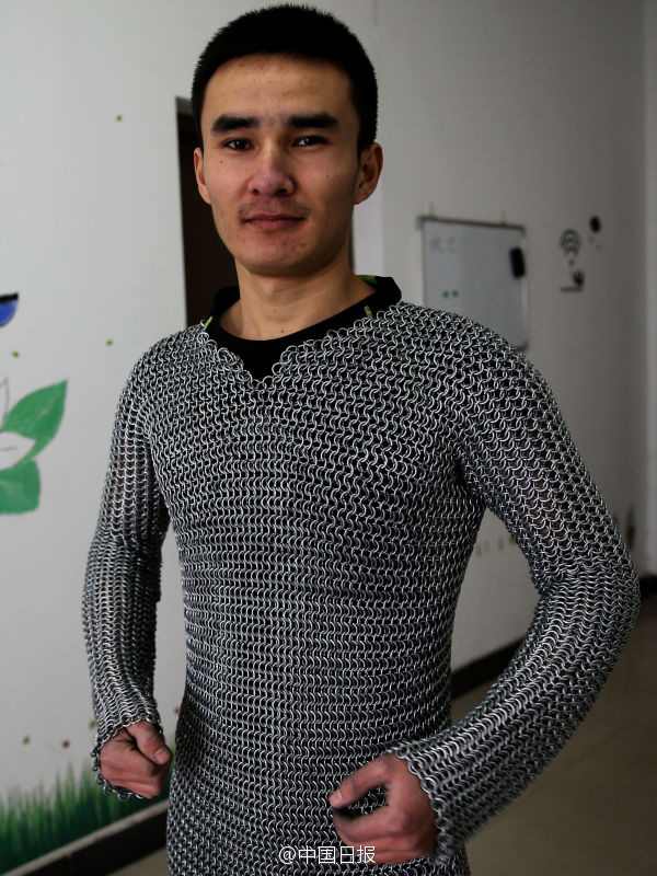 西安电子科技大学的哈斯木花一个月的时间用12000个小铁圈手工制出一件重约20公斤的“锁子甲”。