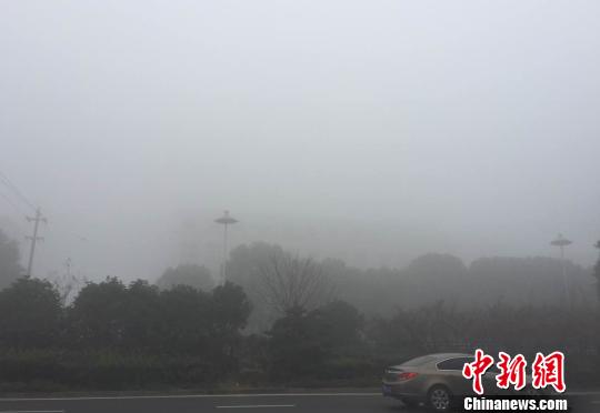 图为1日,扬州遭强浓雾,几十米外的建筑被隐身。 崔佳明 摄