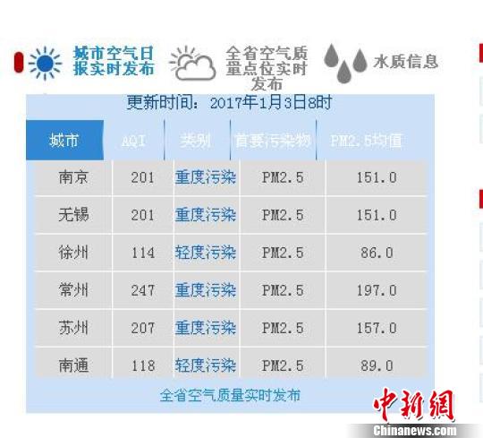 图为3日,江苏各地空气质量均受到不同程度污染。官网截图 摄