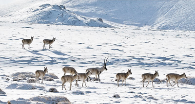 1月3日,在西藏羌塘国家级自然保护区内,一群藏羚羊正在觅食(如图)。近年来,西藏各类自然保护区的藏羚羊种群数逐年增加,已达15万只左右。最新版的《世界自然保护联盟濒危物种红色名录》显示:因保护得力,藏羚羊已从“濒危”降为“近危”。