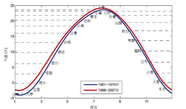 钱诚和其他研究人员基于全国549个气象站的气温记录,经过降噪处理,以1961年到1990年的30年平均值确定了每个节气日的阈值温度。所谓阈值温度,简单来说,就是30年间每个节气日的全国平均气温。从气温记录来看,最冷的节气是大寒,阈值温度为-3.51℃;最热的节气是大暑,阈值温度为23.59℃。