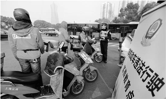 1月3日,杭州交警在环城北路与中山北路路口对电动自行车违法行为进行整治,一会儿工夫就拦下多位外卖小哥,都是逆行。林云龙 汪驰超 摄