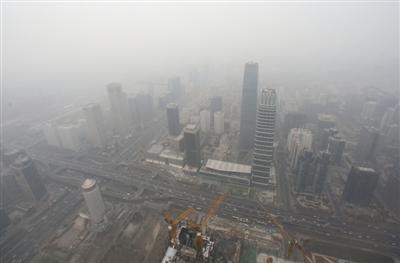 1月7日,北京中国尊,距离地面432米处俯瞰国贸区域被雾霾笼罩着。 新京报记者 王飞 摄