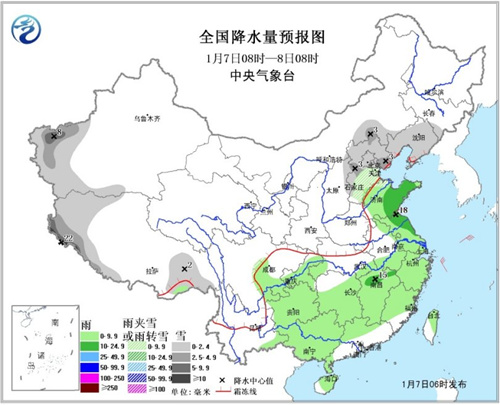 7日08时至8日08时,华北中东部、东北地区南部、新疆南疆西部、西藏西部和东南部等地有小到中雪或雨夹雪,其中西藏西南部的部分地区有大到暴雪,局地大暴雪;黄淮东部、江淮东部、江南、华南北部、西南地区东部等地有小到中雨。东海东北部将有6~7级、阵风8级的风。