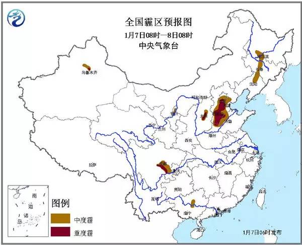 今天,霾范围继续缩减,但华北等地依然被霾笼罩。预计7日08时至8日08时,北京中南部、天津中西部、河北中南部、河南北部、山东西北部、山西中部、四川盆地西部等地有中度霾,其中,北京南部、河北中南部、河南北部、山西中部、四川盆地西南部等地的部分地区有重度霾。为此,中央气象台今天早上6时发布霾黄色预警。