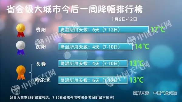 预计至12日,省会级大城市中,贵阳累计降温将达17℃,位于降温幅度排行榜榜首。常受到冷空气影响的东北三个省会级大城市普遍上榜,3至5天内最高气温也将下降10℃以上。