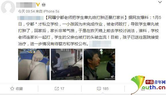 近日有网友爆料称,1月5日江西宁都某私立学校一学生因作业未完成,睾丸被老师打肿,学生父亲在去学校交涉时也被老师打的头破血流,目前孩子已送往医院接受治疗。1月7日下午,该校老师告诉中国青年网记者,网上流传的内容皆为不实消息,真实情况是该校老师被家长手钢管殴打,目前当地公安局已介入此事。