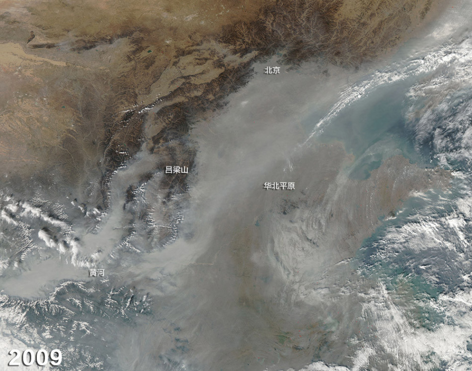 2009年10月28日。最厚重的灰棕色雾霾集中在了低洼的黄河谷地和华北平原西部靠近吕梁山的地区。
