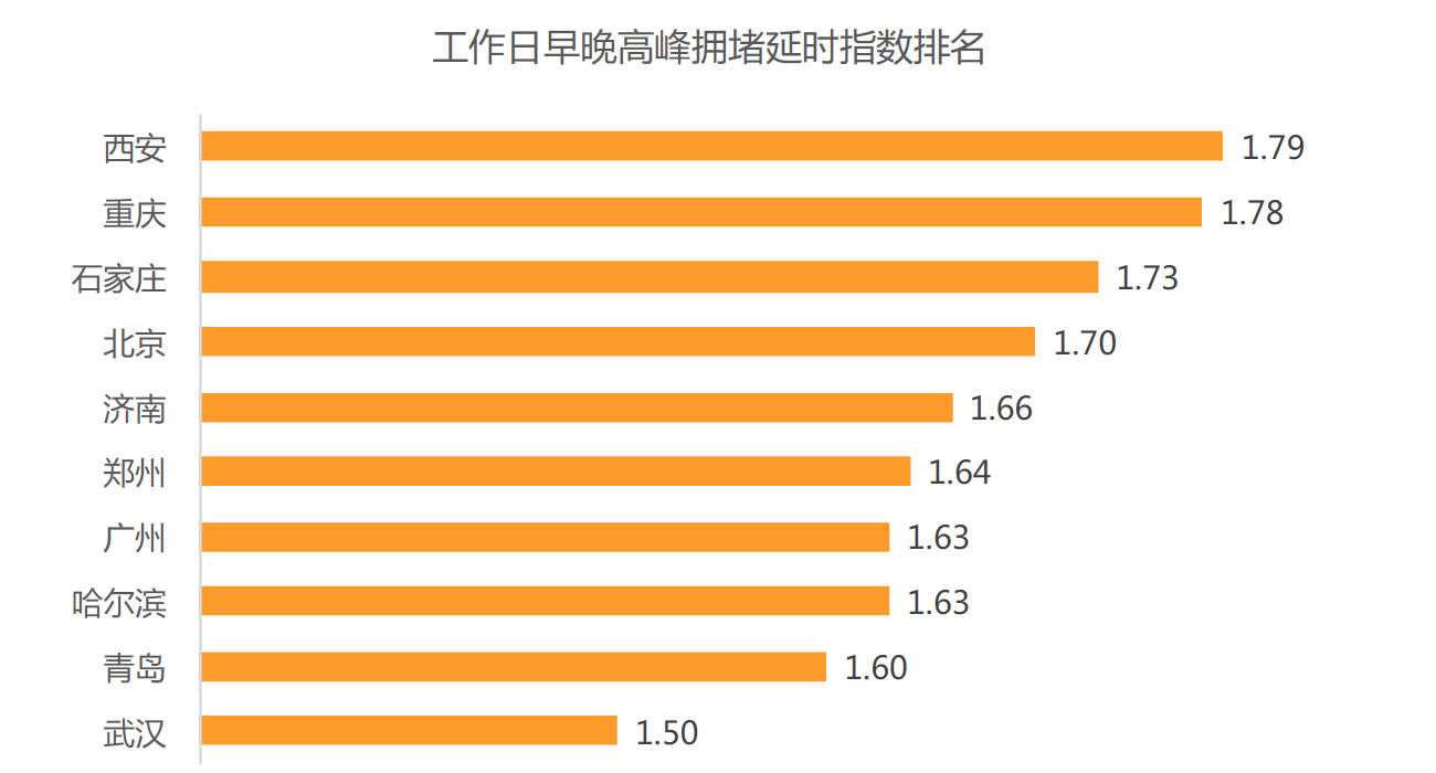 根据高峰期拥堵延时指数,2016年,西安成为堵城冠军,2015年的拥堵冠军重庆,位列第2位,2015年的亚军青岛排名第9。北京虽然位列堵城第4名,因为“社会平均工资”较高,而成为因拥堵造成损失最高的城市,北京人每年损失8717元;在全国最堵的西安,人均拥堵成本为6960元,排名全国第3。