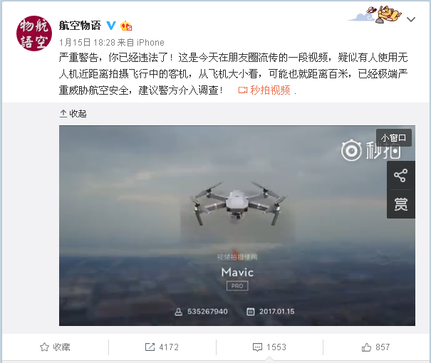1月15日晚上6点半左右,微博认证为“民航自媒体”的ID“航空物语”转发了一则短短8秒的视频,视频中,一架飞机正在降落,画面十分清晰,而在视频最后,有一行说明:“该视频拍摄使用Mavic PRO,拍摄时间2017年1月15日”,并有一串类似于QQ号码的数字。(注:Mavic PRO是大疆公司推出的一款无人机航拍设备)