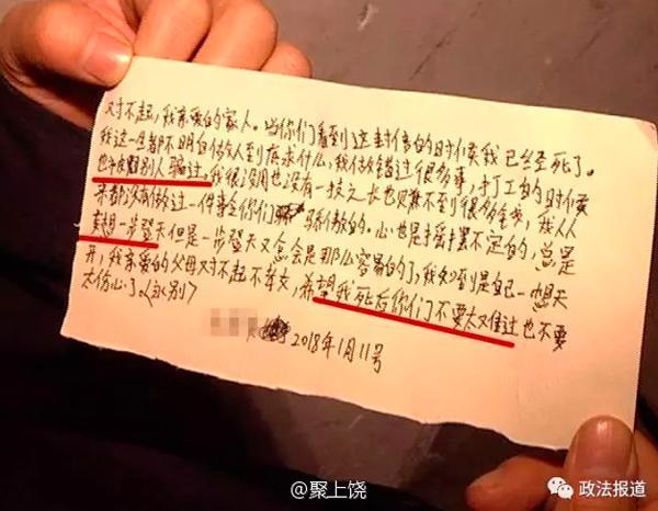 澎湃新闻看到,该纸条落款时间为2017年1月11日,当事人称这一生都不明白做人到底是求什么,没有一技之长也没有赚到钱,自己没用,打工时被骗,也没有做过一件让父母骄傲的事,总妄想一步登天。纸条内容还称,自己死后,希望父母不要太难过。不过,该纸条内容是否系死者本人生前所写,目前尚未得到警方证实。