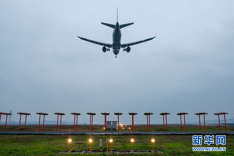 一架飞机借助助航灯光系统,降落至重庆江北机场。新华网 李相博 摄