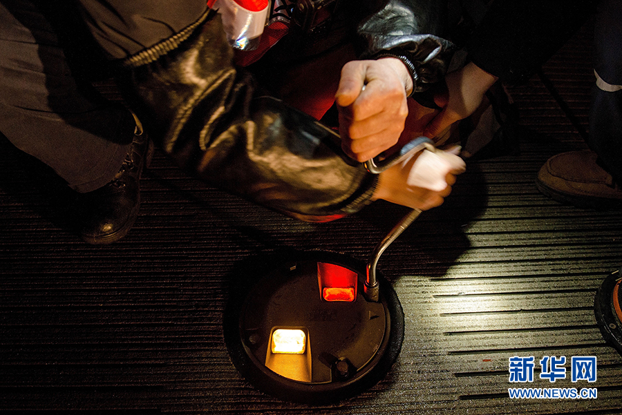巡检工们在对一盏老化的灯具进行更换。新华网 李相博 摄