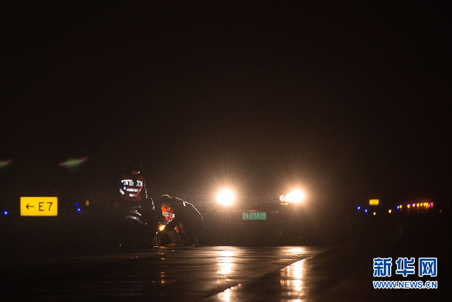 夜幕下,巡检工们利用航班的间隙,在机场跑道上进行作业。新华网 李相博 摄