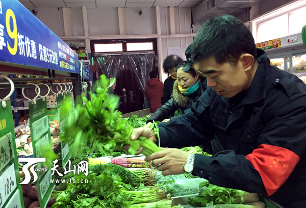 1月16日早上,乌鲁木齐市水磨沟区六道湾片区管委会克拉玛依东路社区便民蔬菜直销点店长王森(右)正在整理货架。