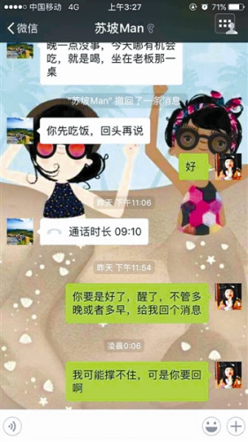 23时54分,琪琪在微信里留言:“你要是好了,醒了,不管多晚或者多早,给我回个消息。”16日零点零6分,琪琪睡觉前留言“我可能撑不住,可是你要回啊”。
