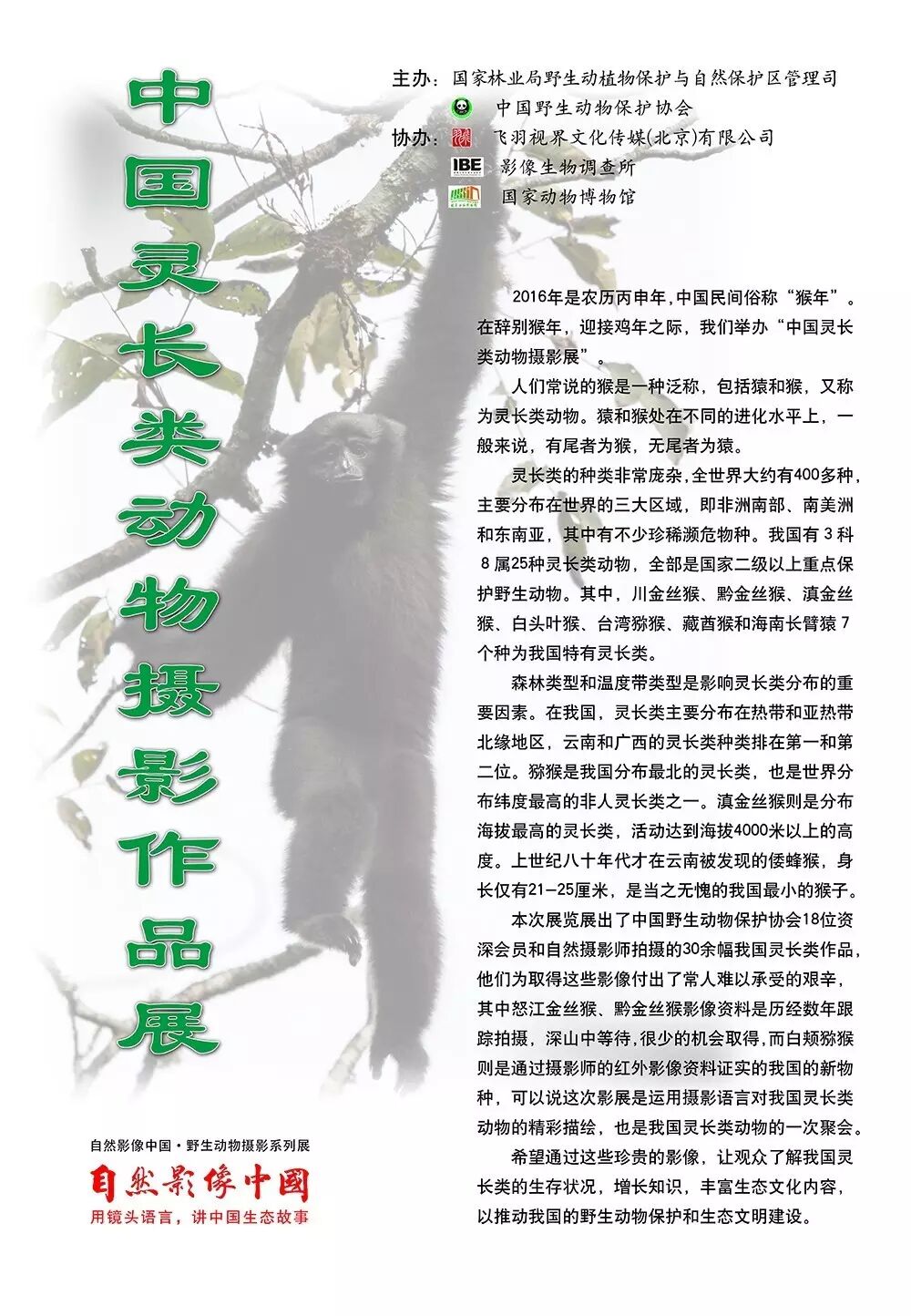 在辞别猴年,迎接鸡年之际,我馆与国家林业局野生动植物保护与自然保护区管理司、中国野生动物保护协会、飞羽视界文化传媒(北京)有限公司以及影像生物调查所联合特别策划了“世界动植物日”公益系列宣传活动暨“辞猴迎鸡”中国灵长类稚类动物摄影作品巡回展。本展开幕式将于2017年1月21日(周六)上午10:00在国家动物博物馆大厅进行。