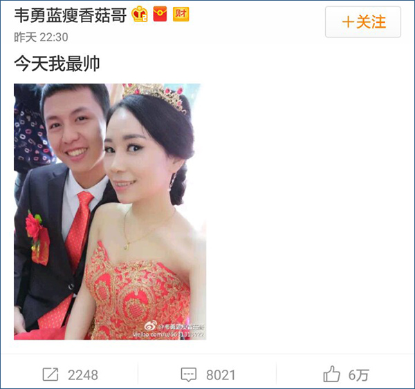 蓝瘦香菇哥结婚啦 再也不能蓝瘦香菇了