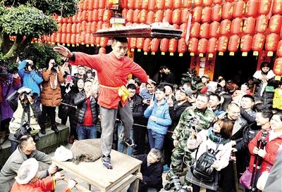 昨日,江津中山古镇千米长宴现场,民间艺人大秀“头顶传菜”绝技。 本报记者 杨新宇 摄