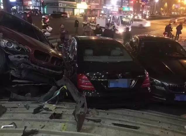 昨天晚上11点多,不少人的朋友圈被一起多辆豪车相撞的消息刷屏了。从图片上看,发生碰撞的车伤得不轻,两个大奔两个宝马,其中暗红色宝马越野车的前保险杠整个掉了下来!