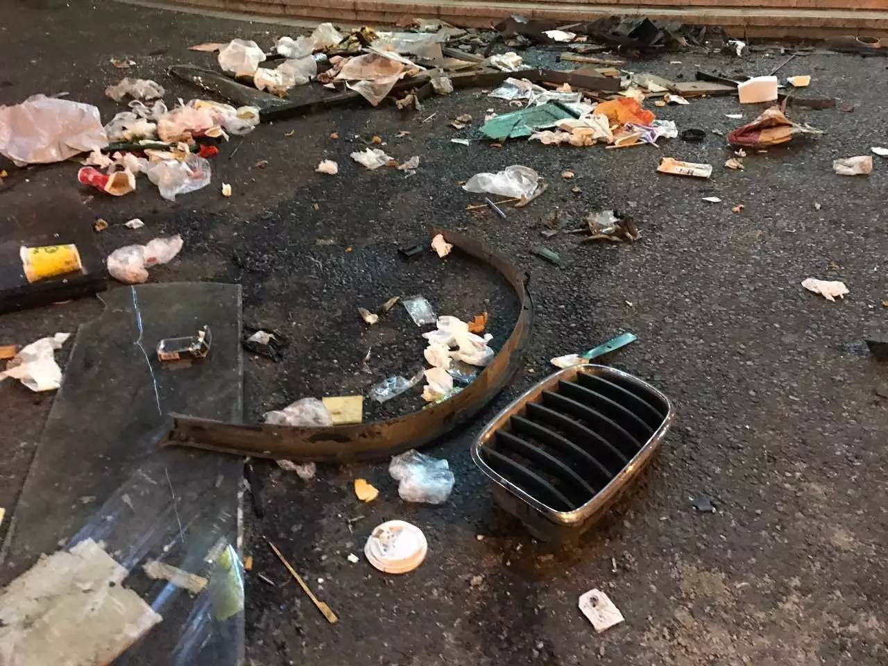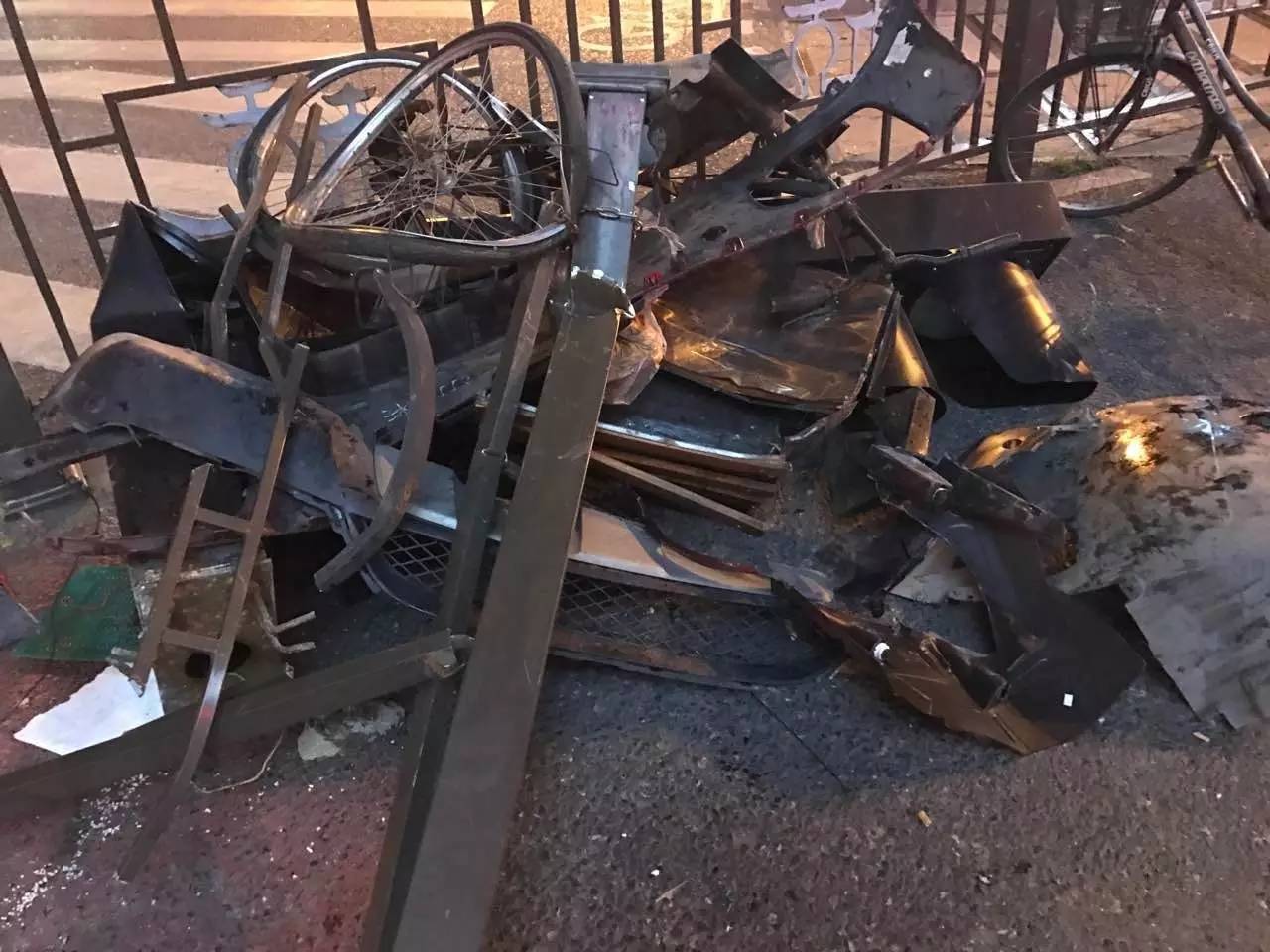 钱江晚报记者赶到现场时,受损车辆均已经被拉走,但是现场狼藉惨状,依然能感受当时撞击有多厉害。在现场,靠近中山北路和文晖路交叉口西南侧一角,堆放着还没处理的碎片,里面有变形的自行车,被撞断的护栏铁柱,车子上的各种配件。