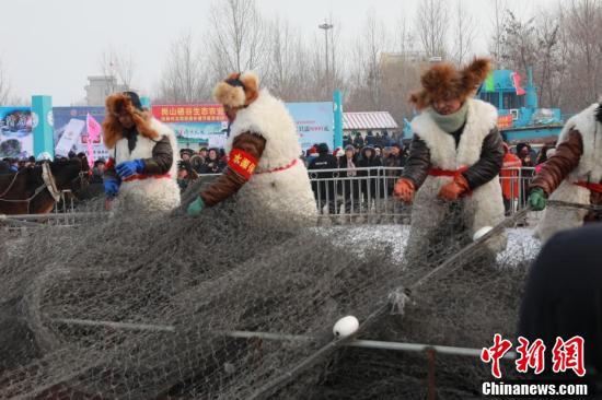 1月22日,辽宁省抚顺市,拉网的渔民。当日,2017神州北湖(中国抚顺)首届冬捕节启幕,民俗表演、拉网出鱼、头鱼拍卖、游客逛年货大集等活动逐一展开。中国北方的冬捕,沿袭悠久的渔猎文化,再现古老的渔猎盛况。此次冬捕,采用2000米的大拉网深入冰底网鱼,每日下网2次,最多时一网可出鱼4万斤左右。开幕当日,头鱼中32斤的胖头鱼、38斤的青鱼和18斤的草鱼,分别拍出90.8万元、46.8万元、46.8万元。中新社记者 沈殿成 摄