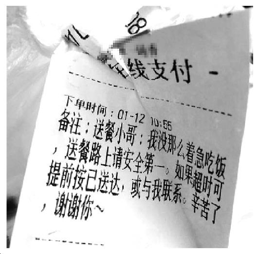 一名顾客在所点外卖小票“备注”栏中写道:“我没那么着急吃饭,送餐路上请安全第一。如果超时可提前按已送达……”