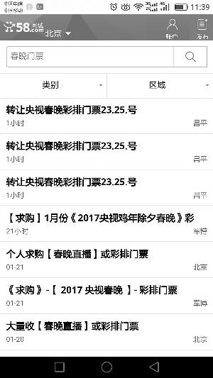 昨天,记者在58同城、闲鱼等多家网络平台上看到有人出售春晚彩排门票。在赶集网上搜索“春晚彩排门票”,页面上会跳出六七条相关帖子。其中一则“转让央视春晚彩排门票”的帖子,提示当红明星鹿晗、张艺兴彩排等信息,标注的价格为3500元。