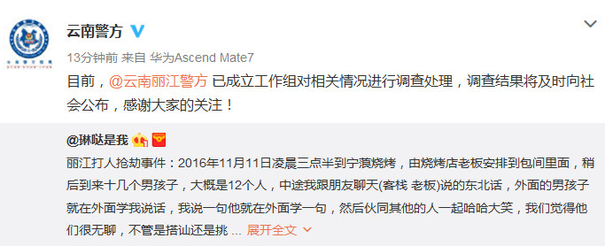 中新网1月25日电 24日,有网友发微博称2016年11月在丽江旅游期间,被一群陌生人暴打。云南省公安厅官方微博今日转发该网友微博并回应,称丽江市公安局已成立工作组对相关情况进行调查处理,调查结果将及时向社会公布。
