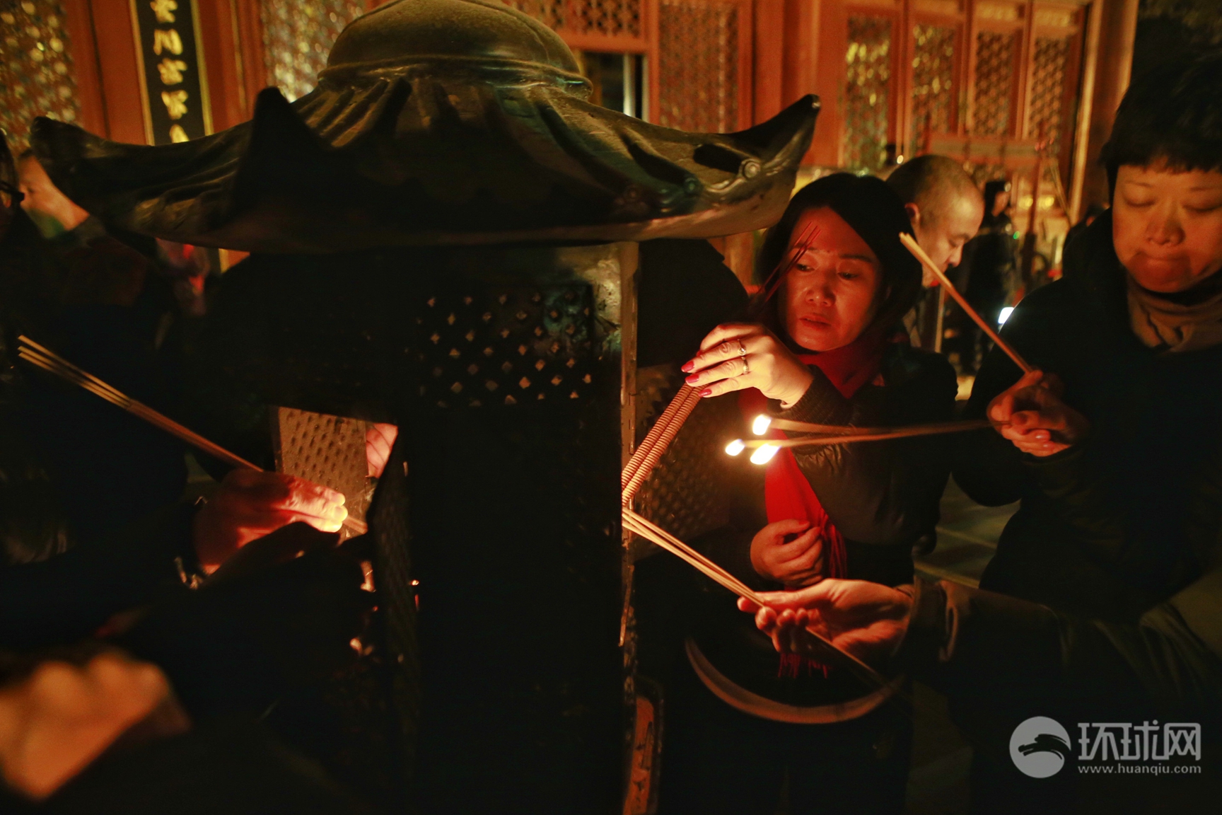 2017年1月28日除夕夜,门头沟区潭柘寺,人们在此烧香祈福,期盼新的一年会有好运气。为了争得新年头香,零点时分成了进香的高峰,大年初一凌晨到清晨的进香人数约15000人左右。(摄影:《环球时报》英文版 李昊)