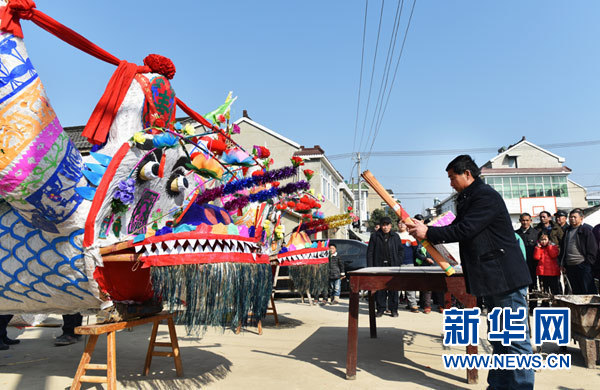 在锣鼓声中,村民们把制作好的龙头搬运出来。(应康伟 摄)