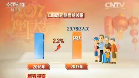 中国鸡年春节七天假期,带动的是40天的大迁徙。国家发改委、交通运输部等部门预测,2017年中国春运旅客发送量将达29.78亿人次,同比增长2.2%。其中,道路25.2亿人次,增长1%;铁路3.56亿人次,增长9.7%;民航5830万人次,增长10%;水运4350万人次,增长2%,近十年春运交通数据几乎年年创新高,说明春运规模在逐年扩大。