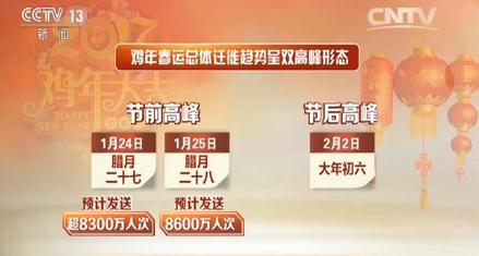 中国各地的火车站、长途客运站以及飞机场等,在巅峰时刻成为世界上人口最密集的地方之一。鸡年春运总体迁徙趋势呈双高峰形态,1月24日(腊月二十七)、25日(腊月二十八)为节前高峰,而2月2日(大年初六)则为节后迁徙高峰;预计24号发送旅客总量超8300万人次;预计25日铁路、公路、民航、水路日发送旅客总量达8600万人次。