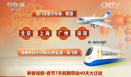 而热门迁徙火车站、机场集中在北京、上海、广州、深圳等一线中心城市,高峰时段平均每40秒起落一架飞机。