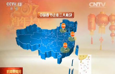 中国春节迁徙三大板块分别是京津冀、长三角、珠三角三大城市群。以地域而言,春运期间客流总量排名前10名都是劳务输出大省、劳务输入大省:广东、江苏、河南、四川、浙江、安徽、湖南、广西、北京和江西。按城市的客流总量排名,北京、上海、广州占前三甲,深圳、成都紧随其后。