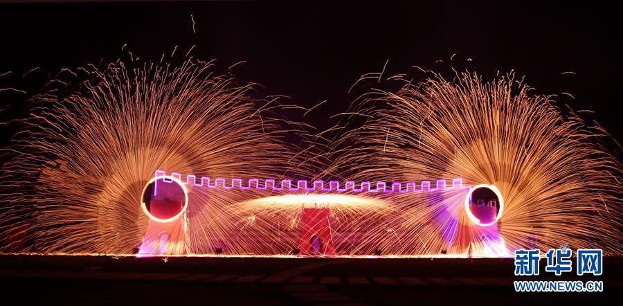 2月2日拍摄的河北磁县“打铁花”表演。春节期间,河北磁县举办“打铁花”表演。“打铁花”是以小炼铁炉将生铁化成铁水后,用木板将铁水加锯末打上天空,在空中形成“铁花火雨”的景象。新华社记者王晓摄