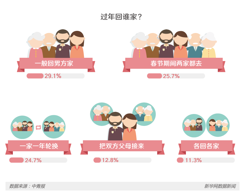 相关调查数据显示,将近30%的受访者表示目前一般都是回男方家过年;但实际上,大部分人心里都希望采取“轮流制”,一年一家,或者干脆把父母接过来一起过年,但考虑到父母身体条件或自身居住条件等原因,只得作罢。