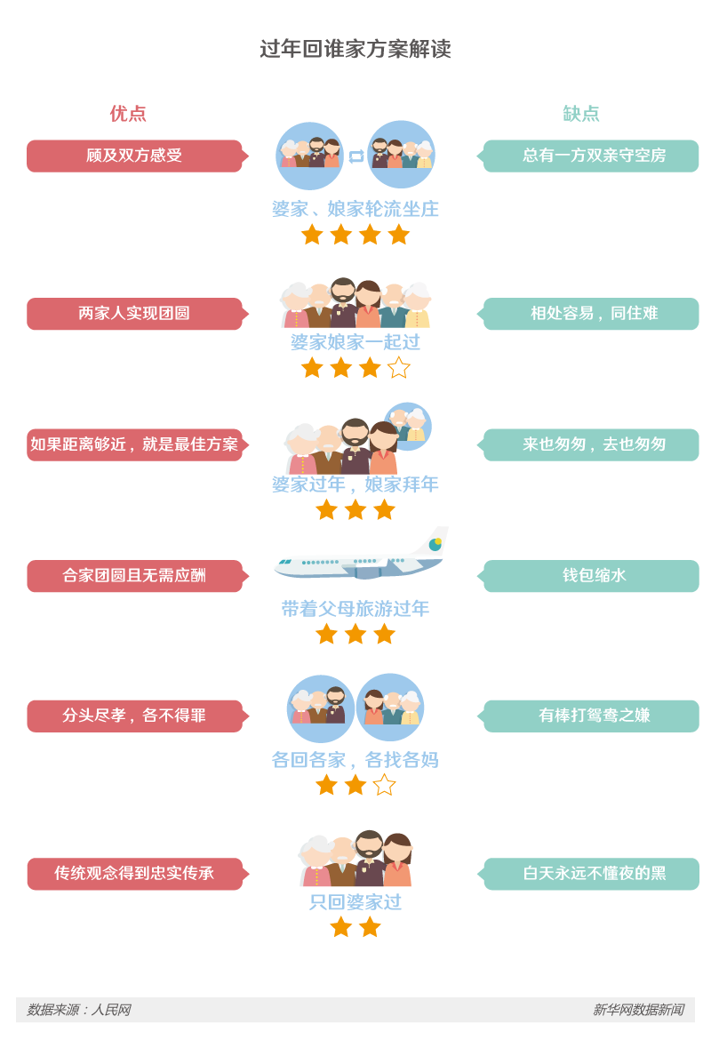 夫妻争着回自己家陪父母过年,出发点都是为了尽孝,但若因此导致感情出现问题,甚至让婚姻出现危机,就未免舍本逐末。在此小编就对夫妻过年回家的几种解决方案做个“评估”,供大家参考: