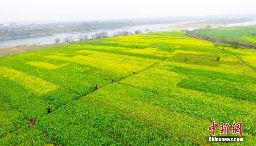 2017年2月3日,当日立春。航拍下的江西省新余市渝水区新溪乡万亩油菜花基地风光秀丽,金灿灿的花朵陆续绽放迎春。随着气温逐渐回升,江西省各地乡村花开遍野、黄绿相间、鸭群戏水,吸引众多游客前往踏青赏花,采撷春光。 赵春亮 摄